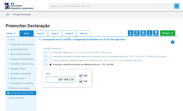 A consignação do IRS e do IVA pode ser efetuada durante a entrega do IRS (entre 1 de abril e 30 de junho).